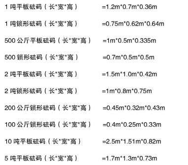 砝码整体形状:矩形设计形状,并要求在砝码两侧有可用于装卸的沟槽和在砝码底部用叉车搬运的搬运沟槽。砝码的边和角应修圆,表面不应有锐边或锐角和的砂眼,以 止磨损和积灰。按我方图纸尺寸。
